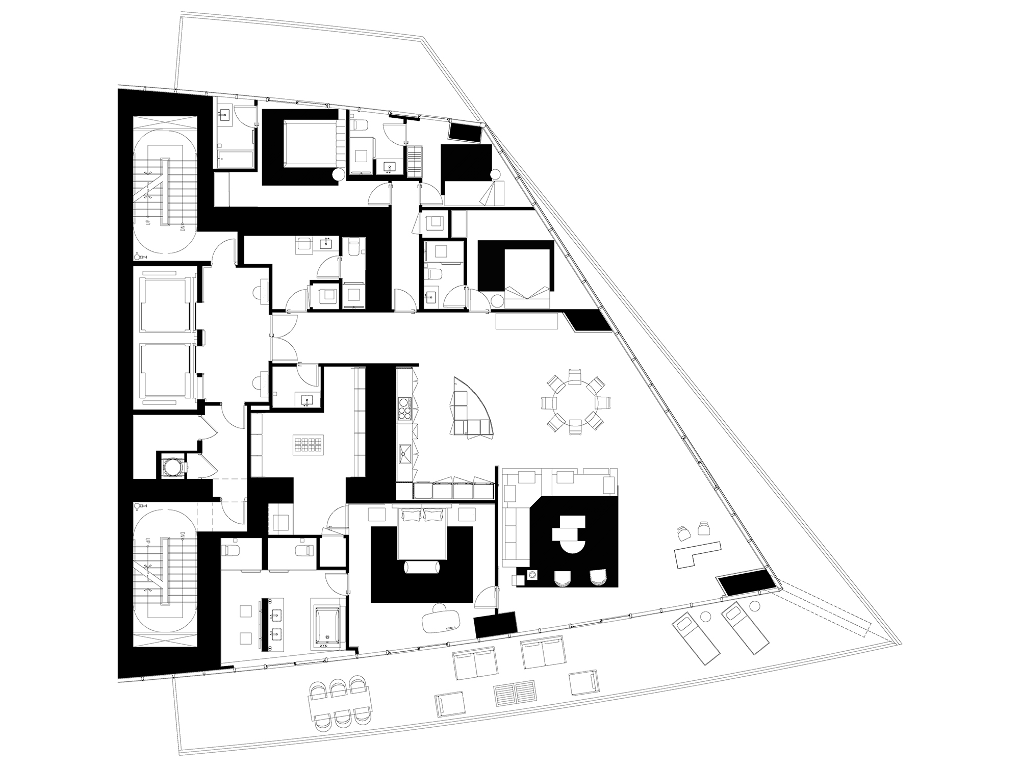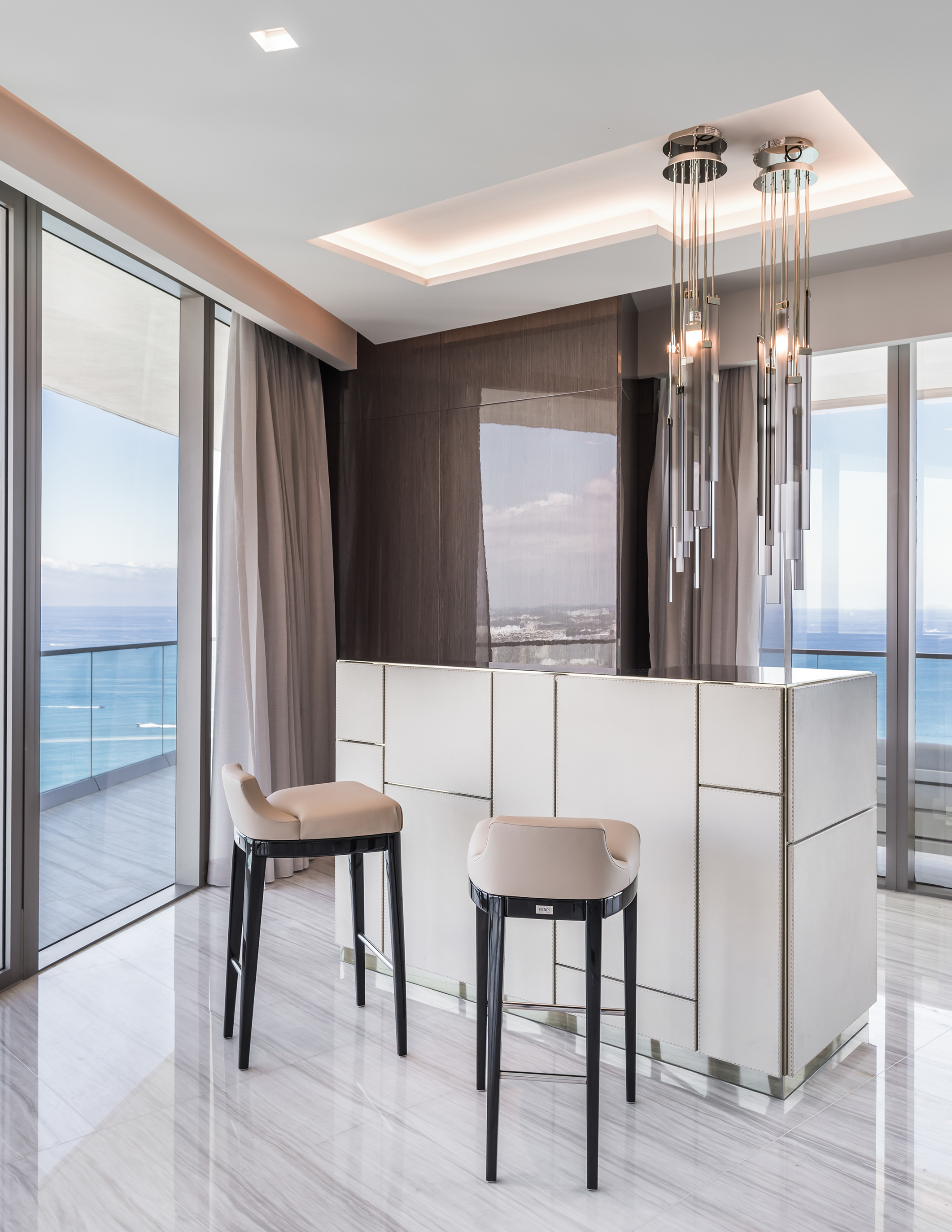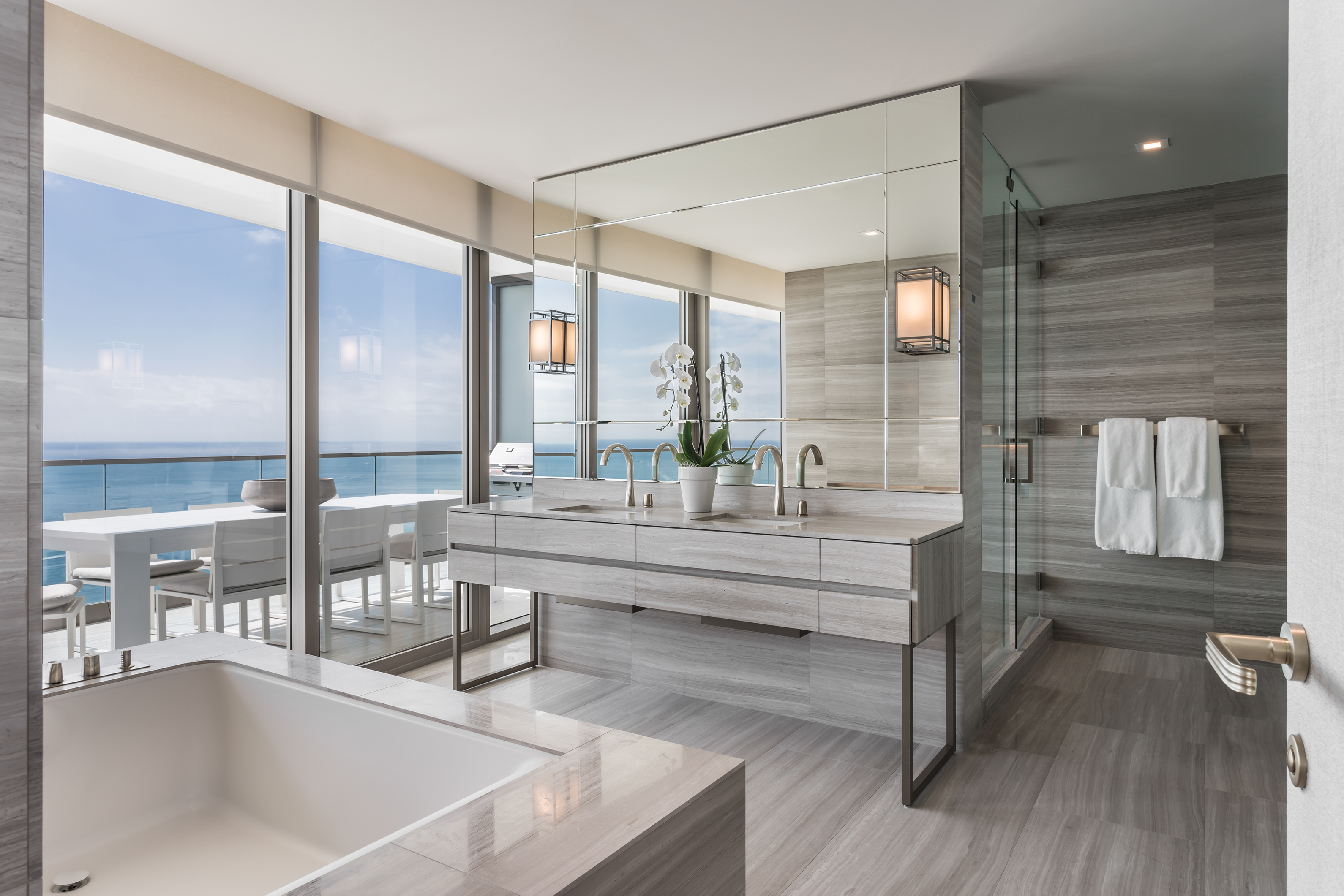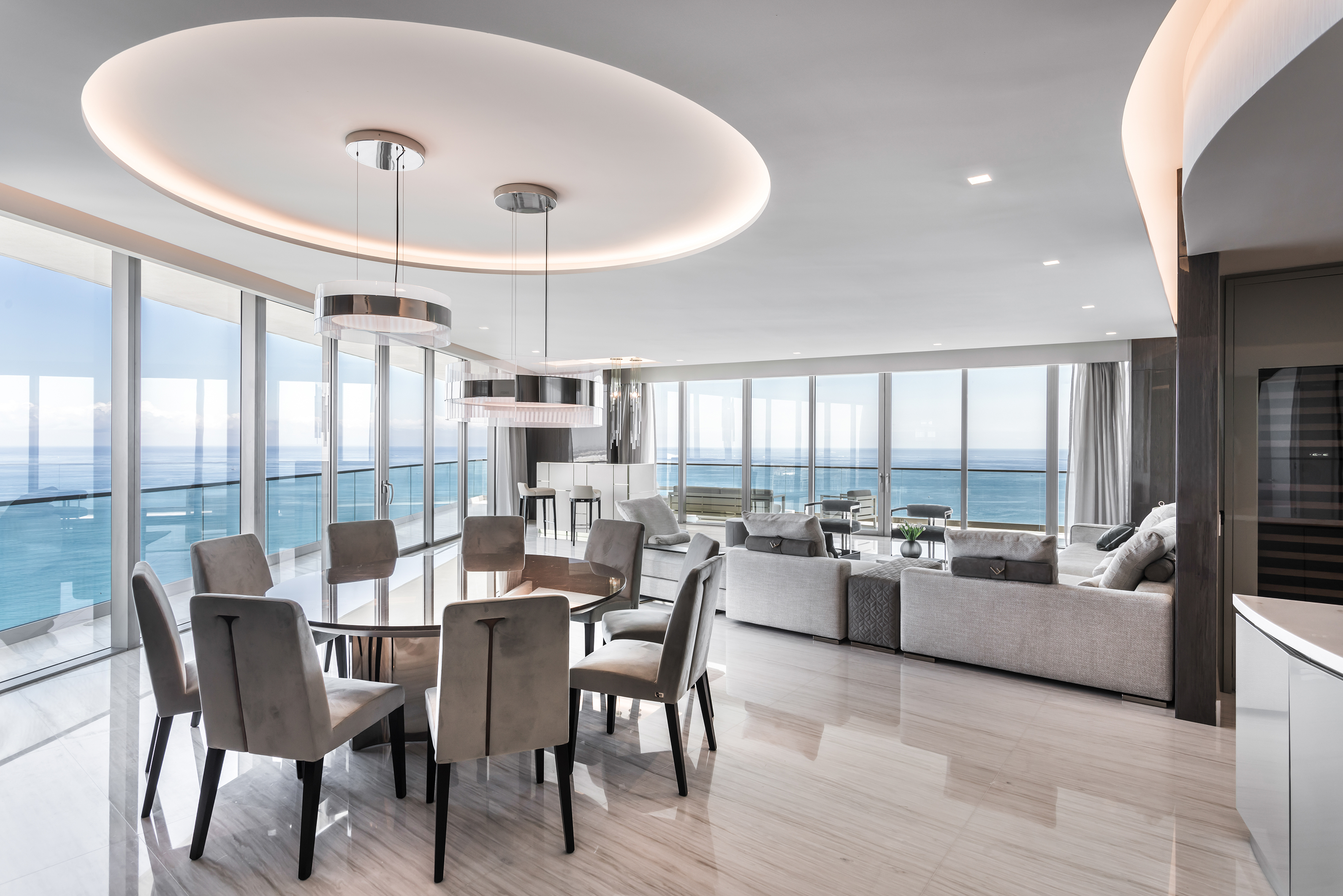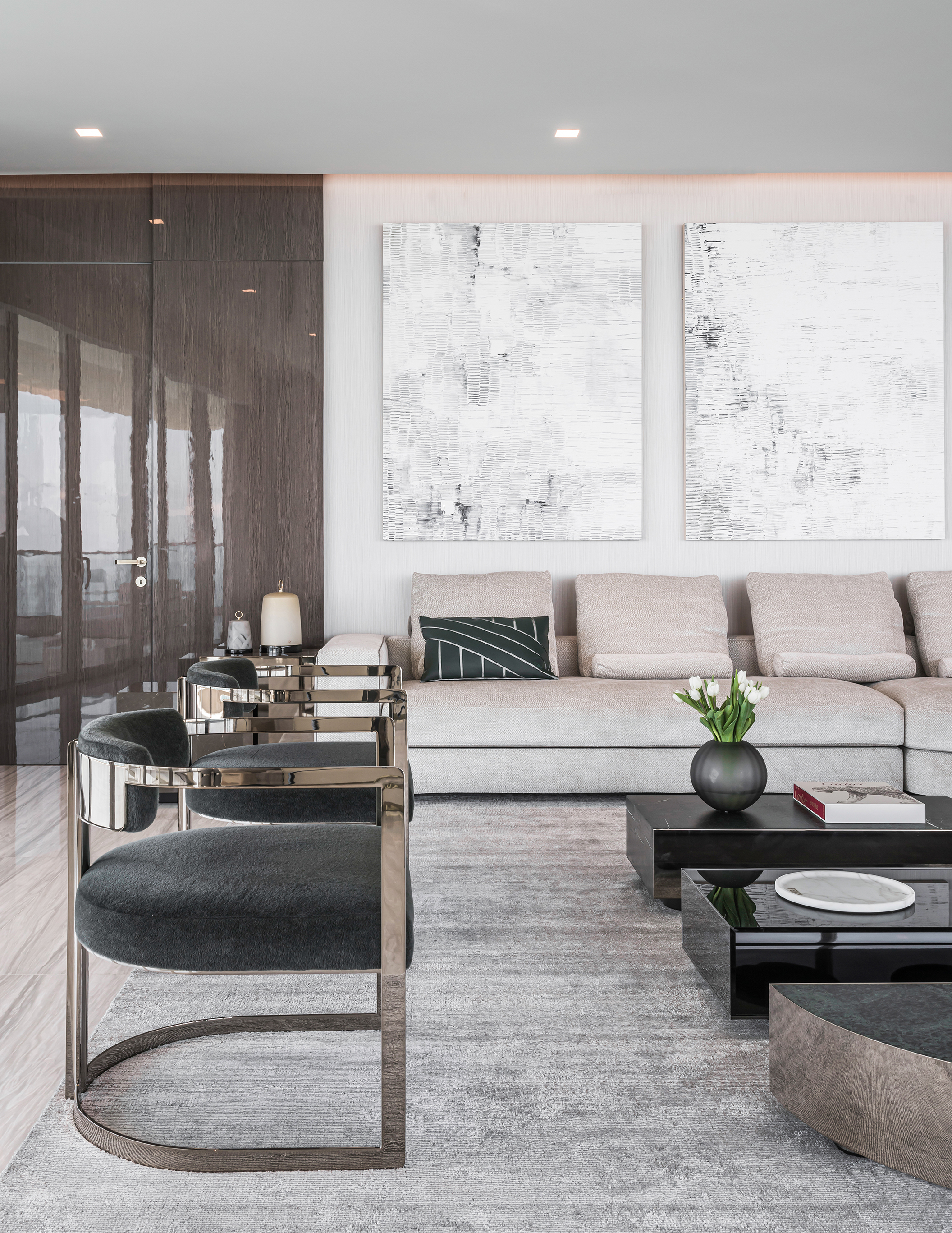 This modern, luxurious design blends soft grays and whites with bold green and black accents. Contemporary art and innovative lighting enhance sophistication, creating a refined yet inviting atmosphere.