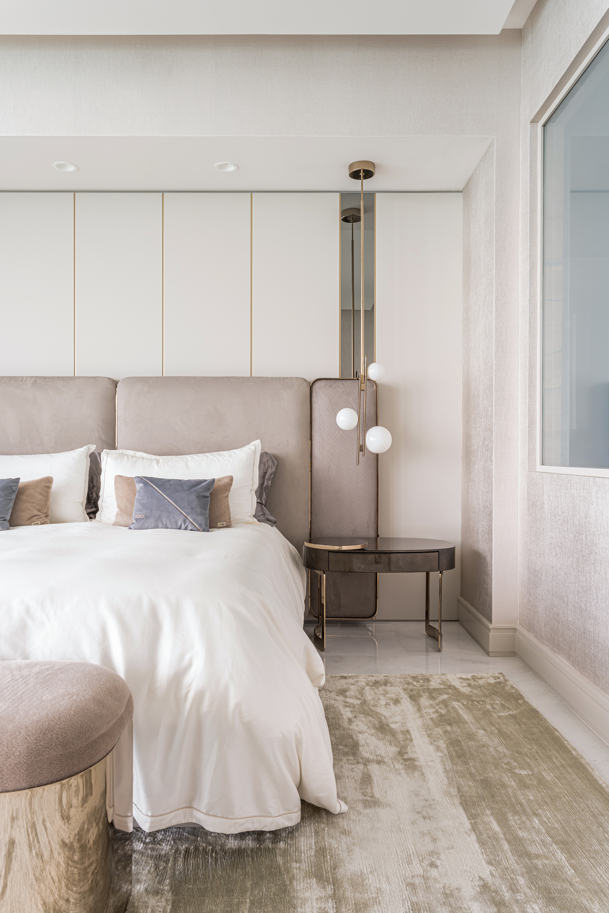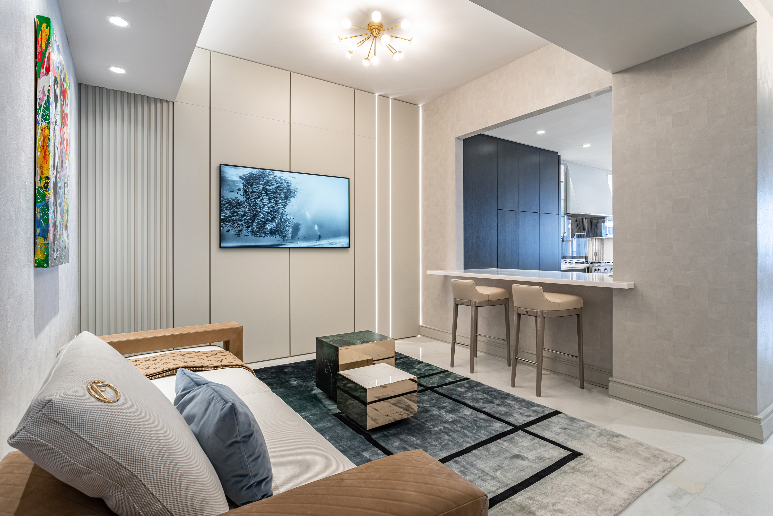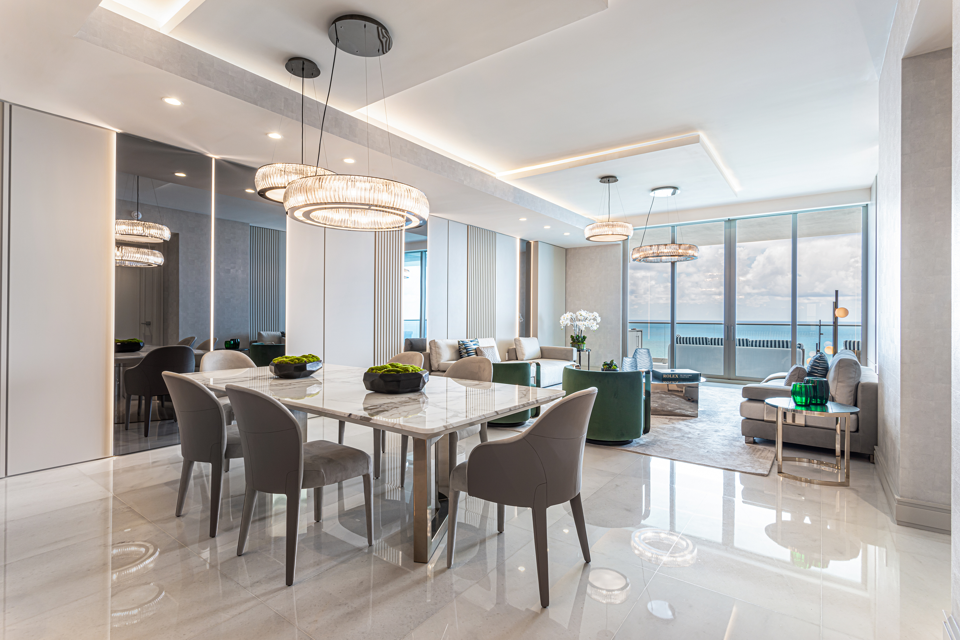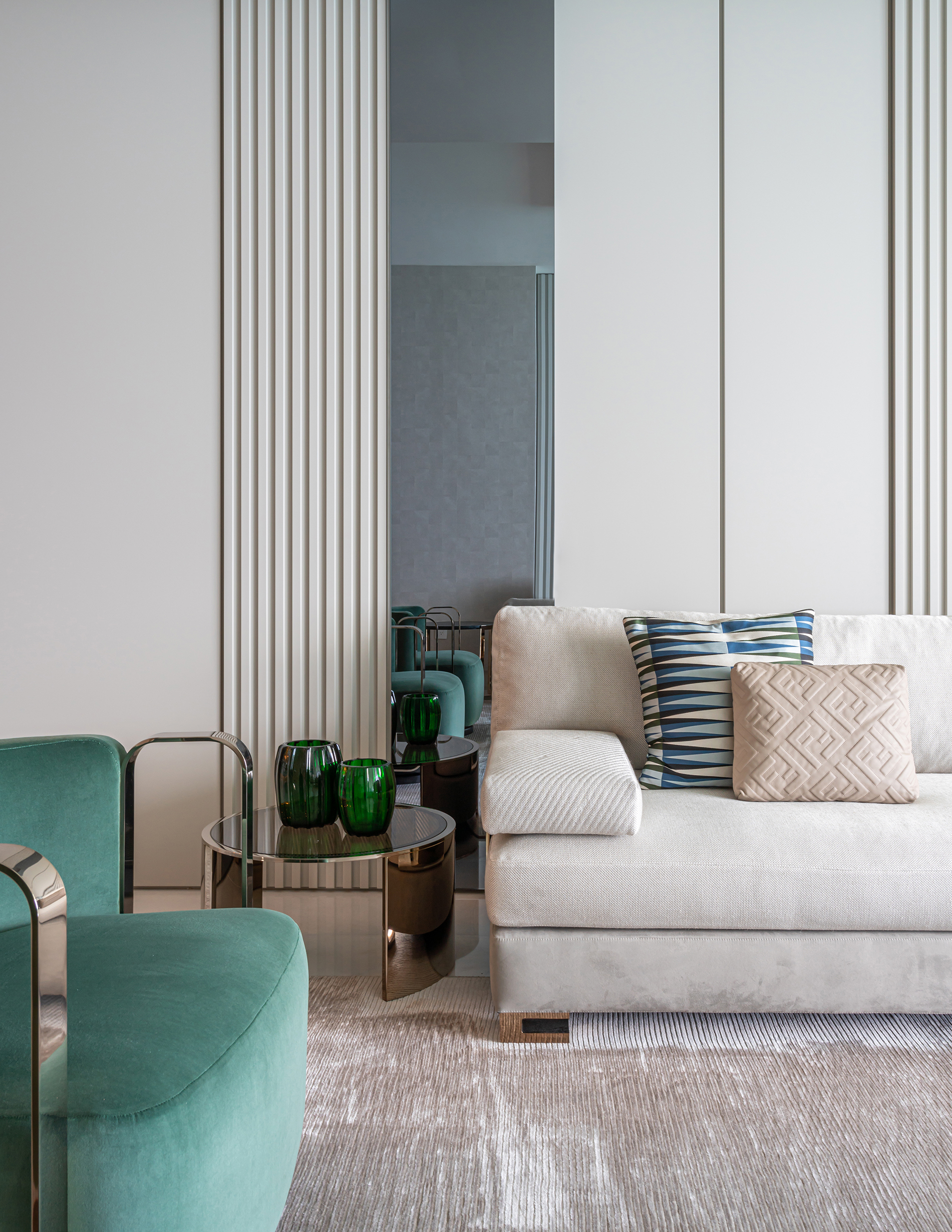 This project embodies sleek contemporary luxury, blending neutral tones with vibrant greens and rich textures. Cohesive and elegant, it harmonizes modern sophistication with functional comfort.