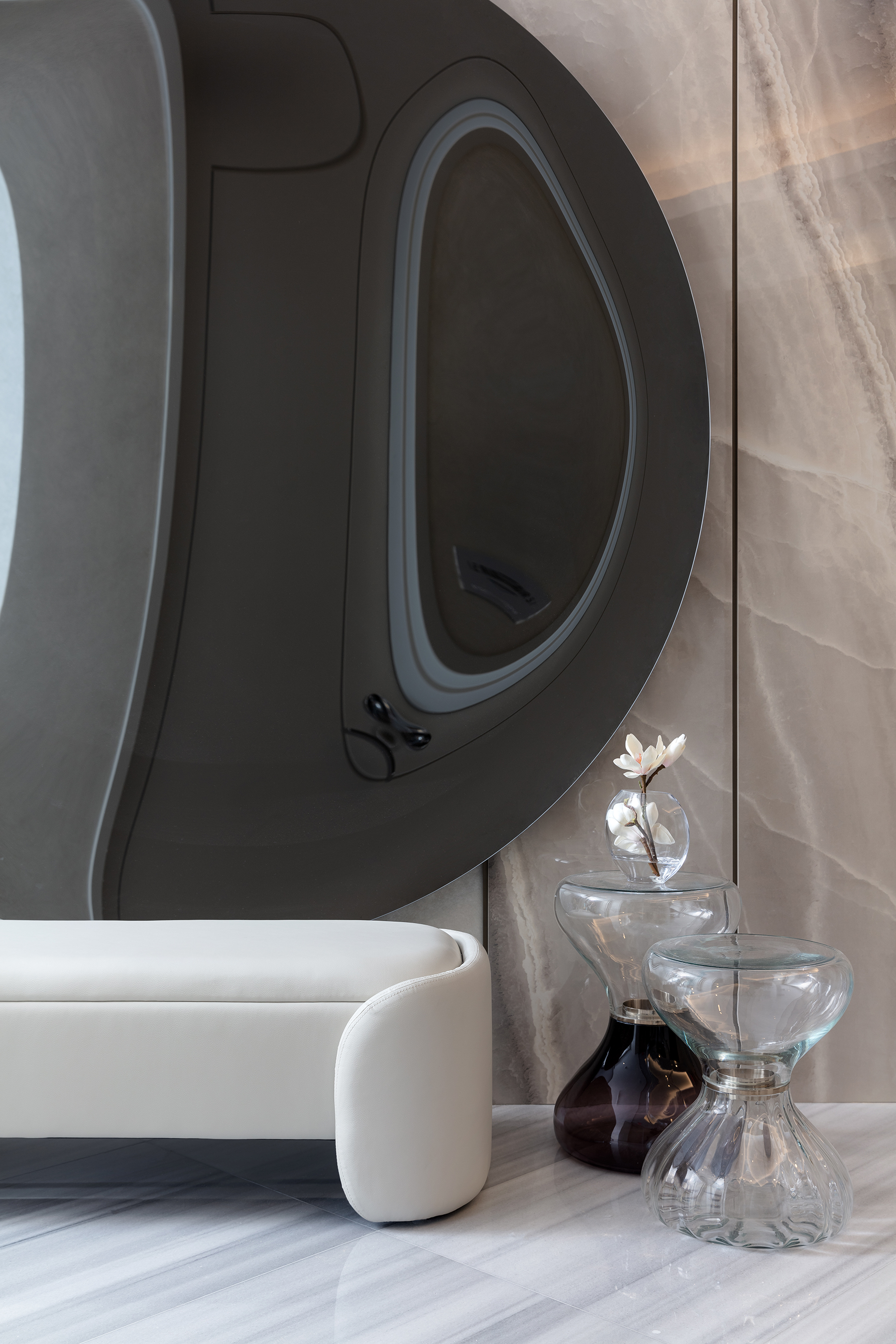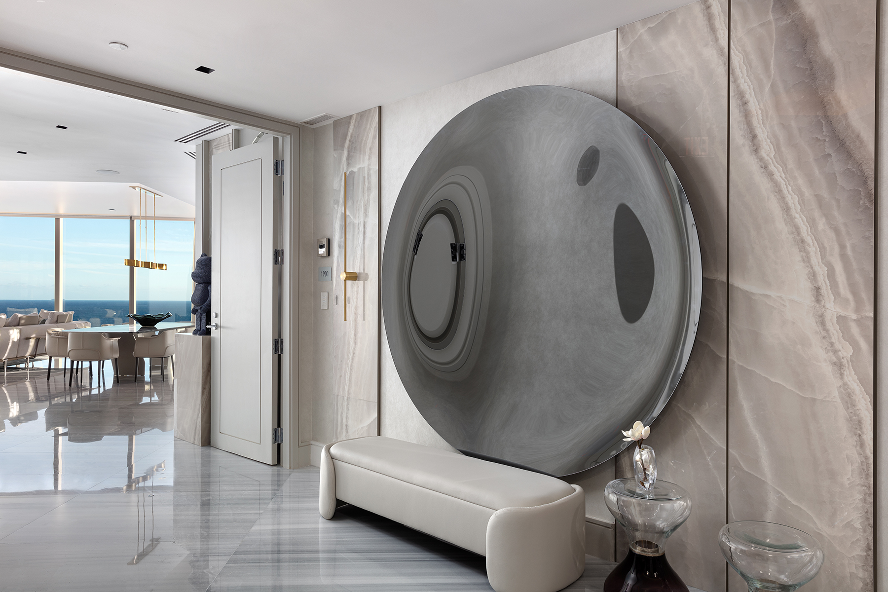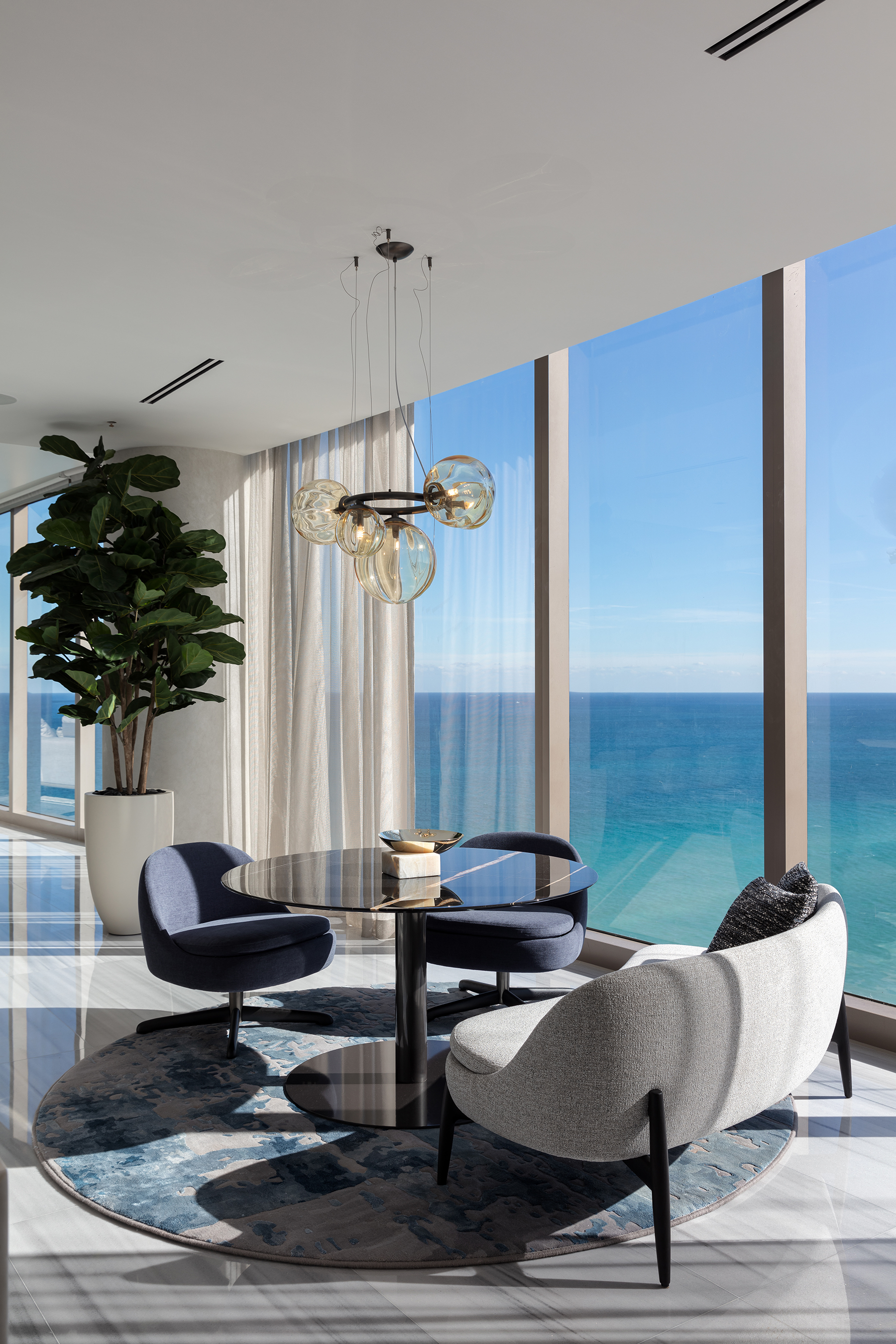 The breakfast nook merges with ocean views, featuring a circular table and curved sofa for a tranquil, luxurious ambiance.