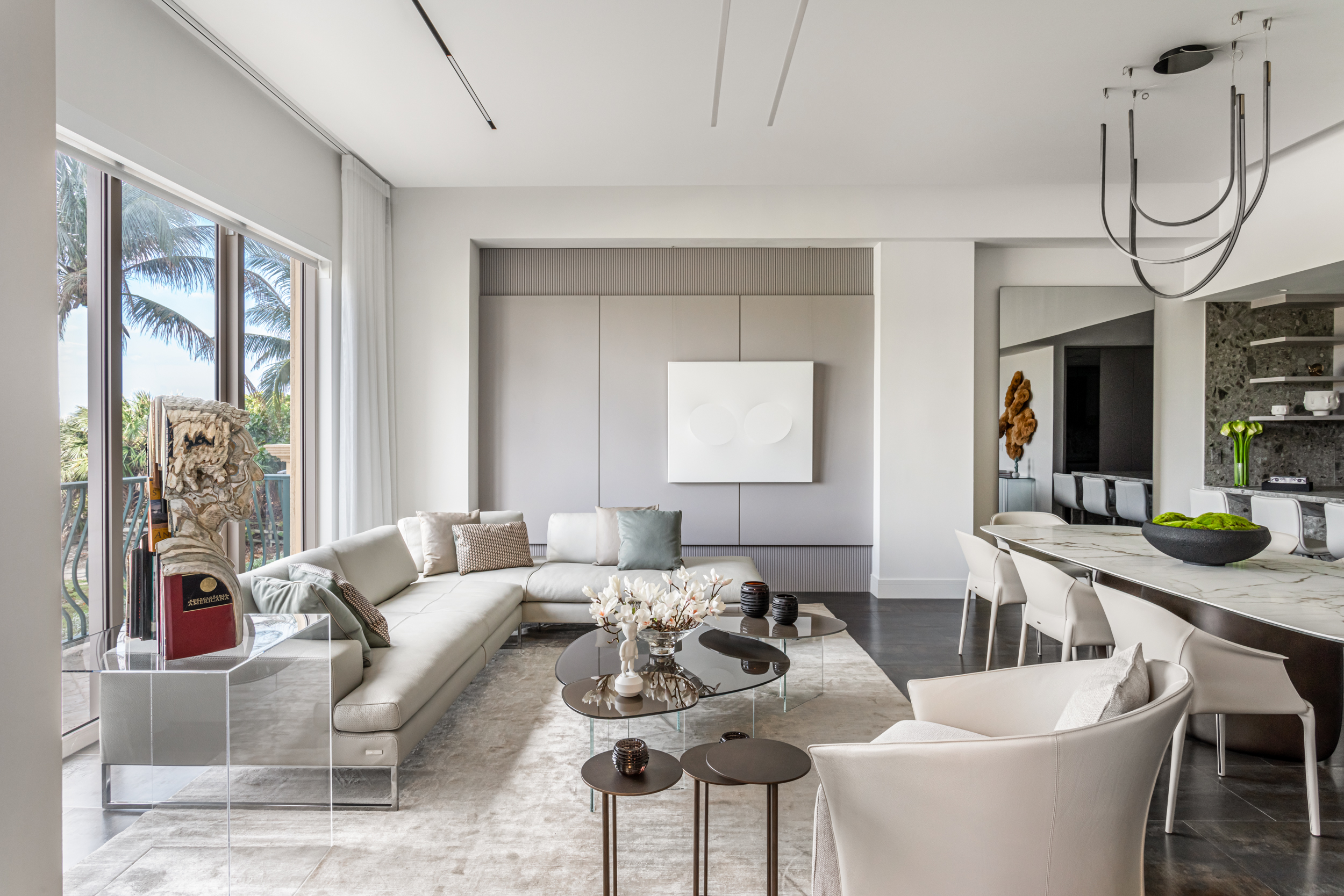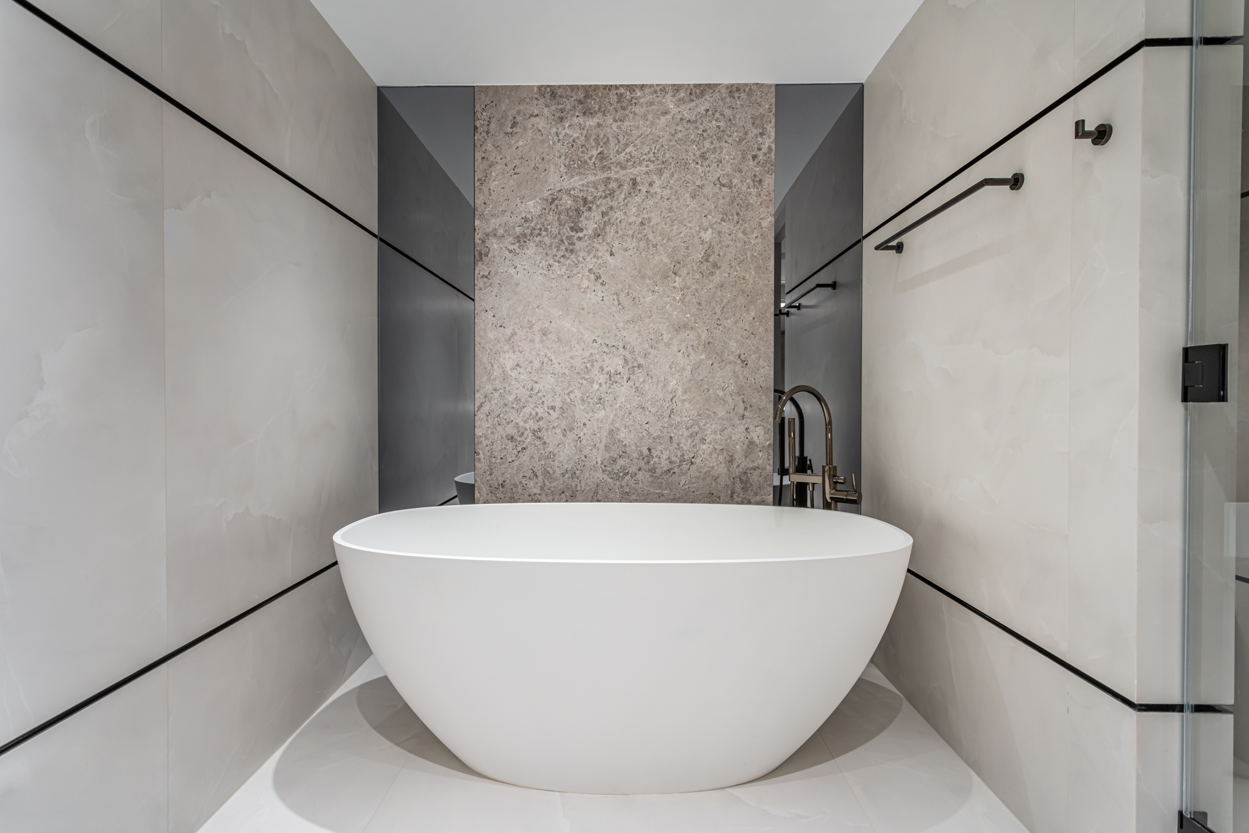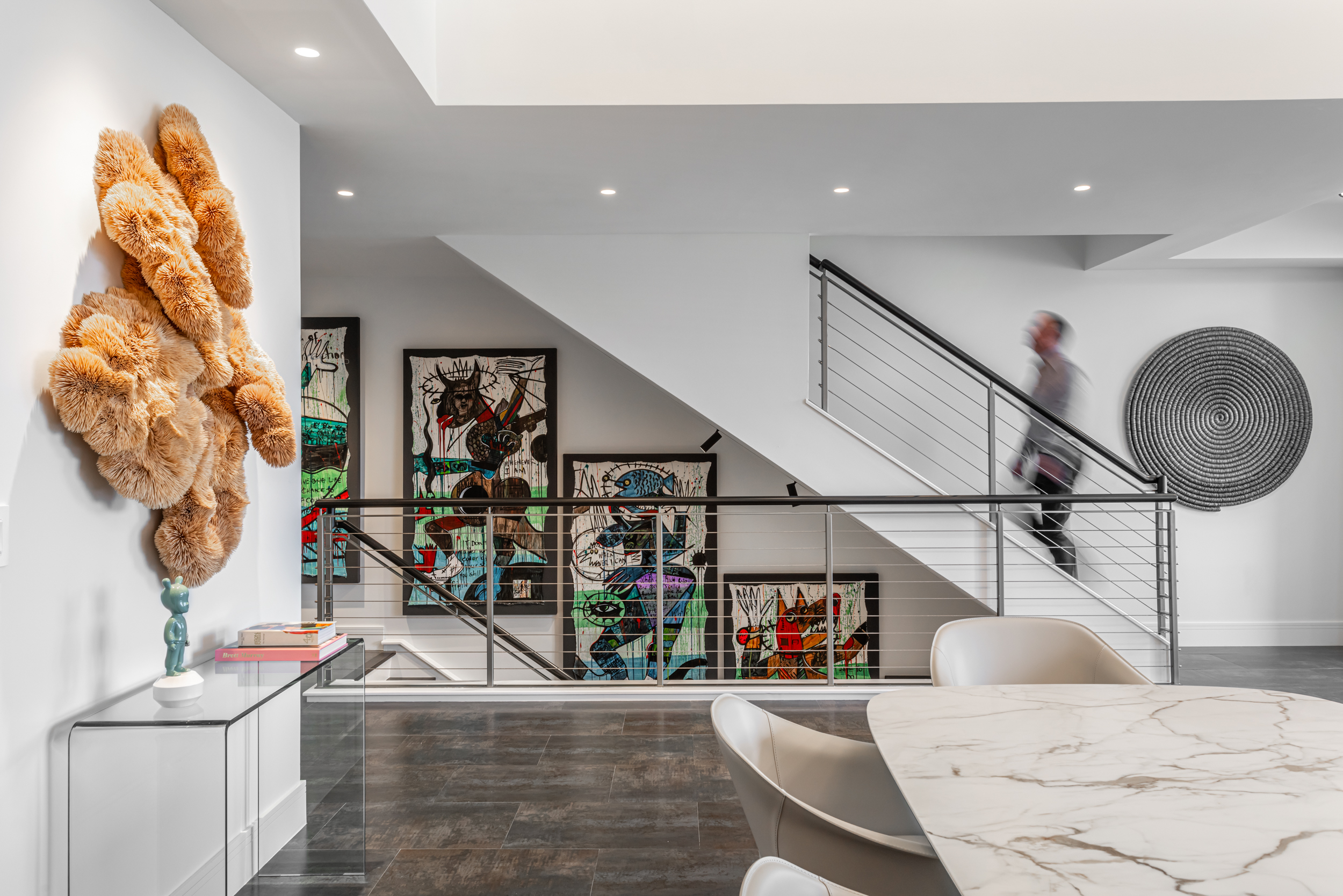 This contemporary design balances elegance and serenity with neutral tones. Abstract art and sculptural elements add character, while natural stone brings organic warmth, creating a sophisticated yet cozy space.