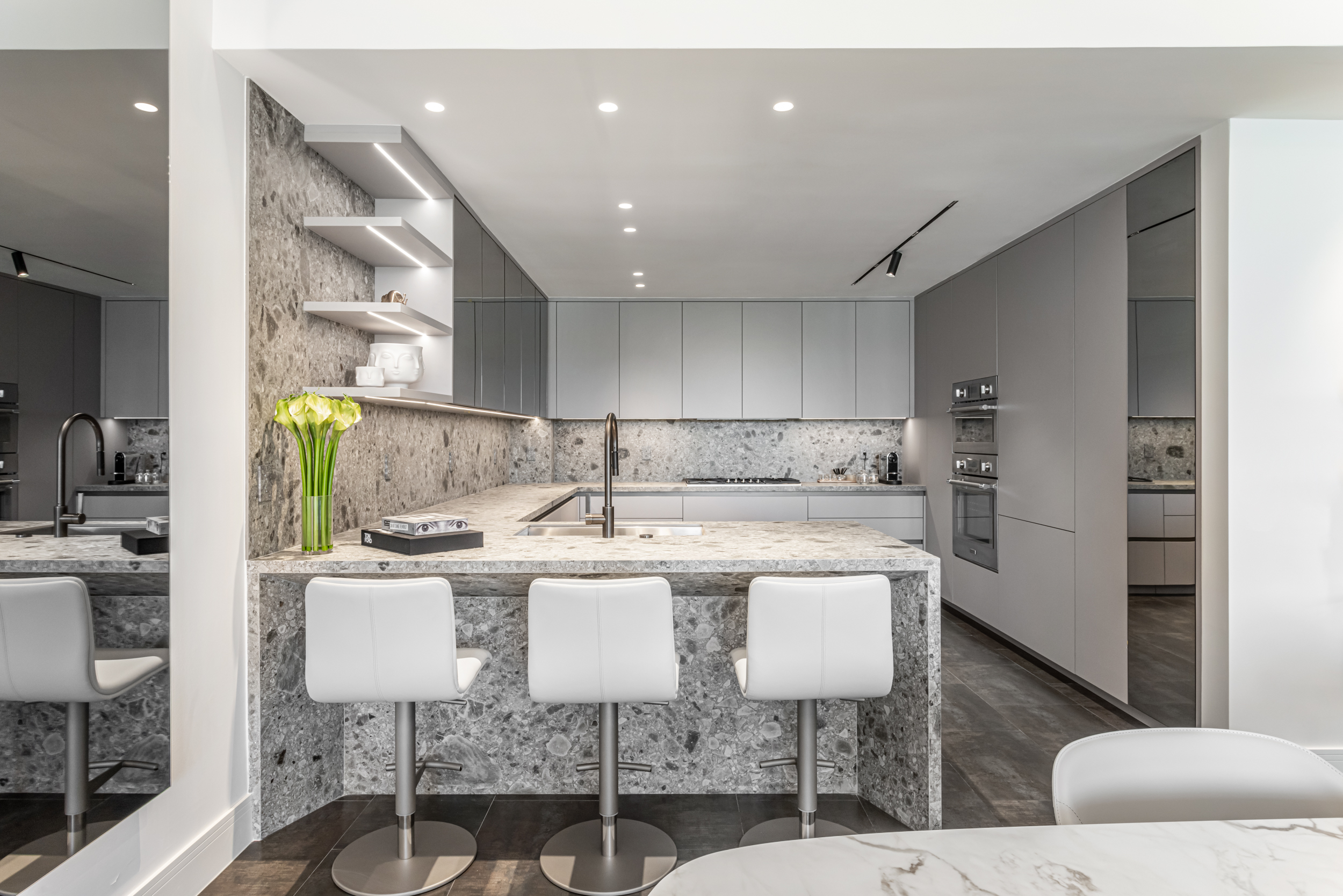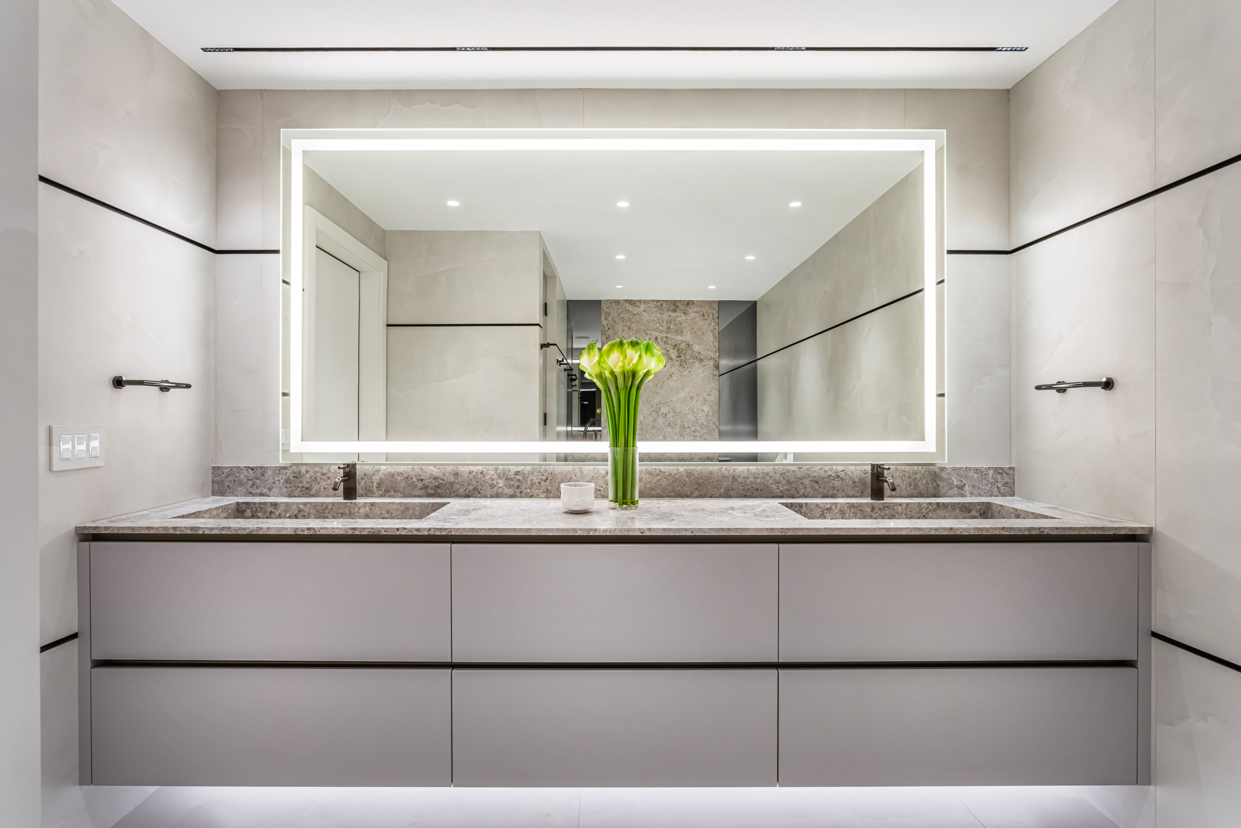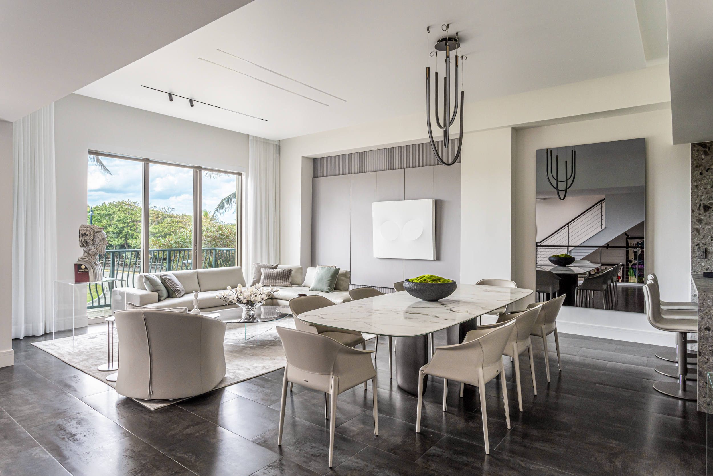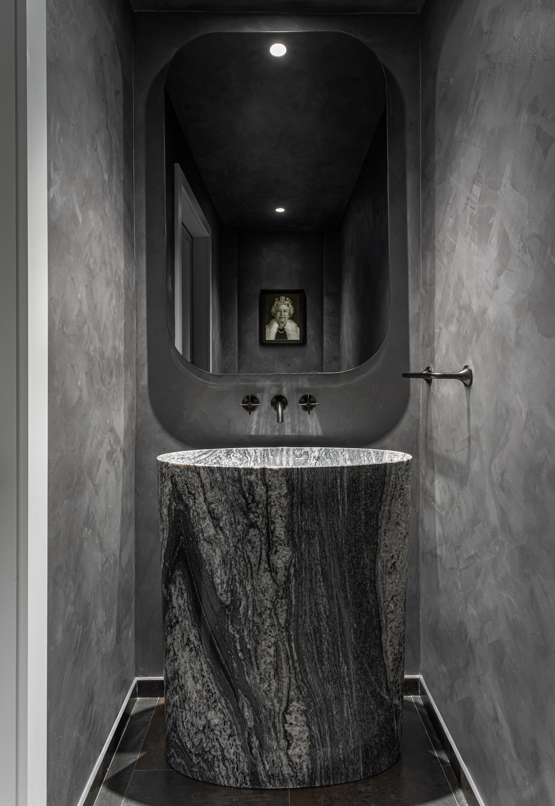 This contemporary design balances elegance and serenity with neutral tones. Abstract art and sculptural elements add character, while natural stone brings organic warmth, creating a sophisticated yet cozy space.